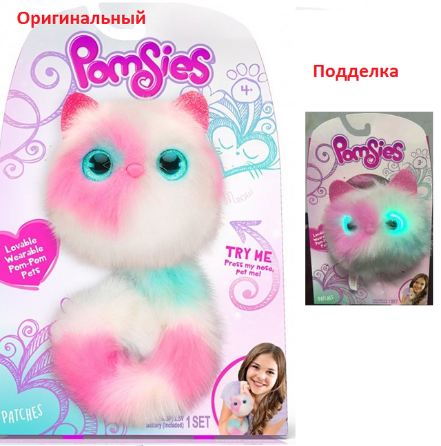 Нижче порівняння оригінальної іграшки Pomsies (розташована праворуч) та популярної китайської підробки (розташована ліворуч)